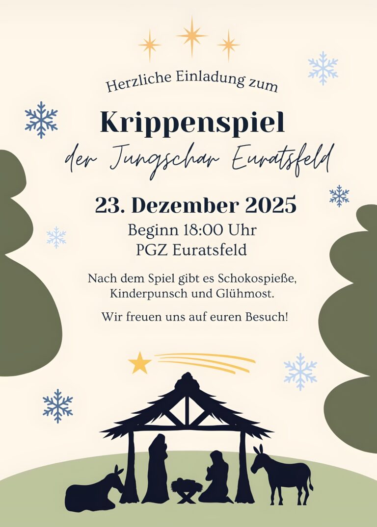 Am 23. Dezember 2025 lädt die Jungschar Euratsfeld um 18:00 Uhr alle sehr herzlich zum diesjährigen Krippenspiel in das PfarrGemeindeZentrum ein. Nach dem Krippenspiel sind alle noch sehr herzlich zu