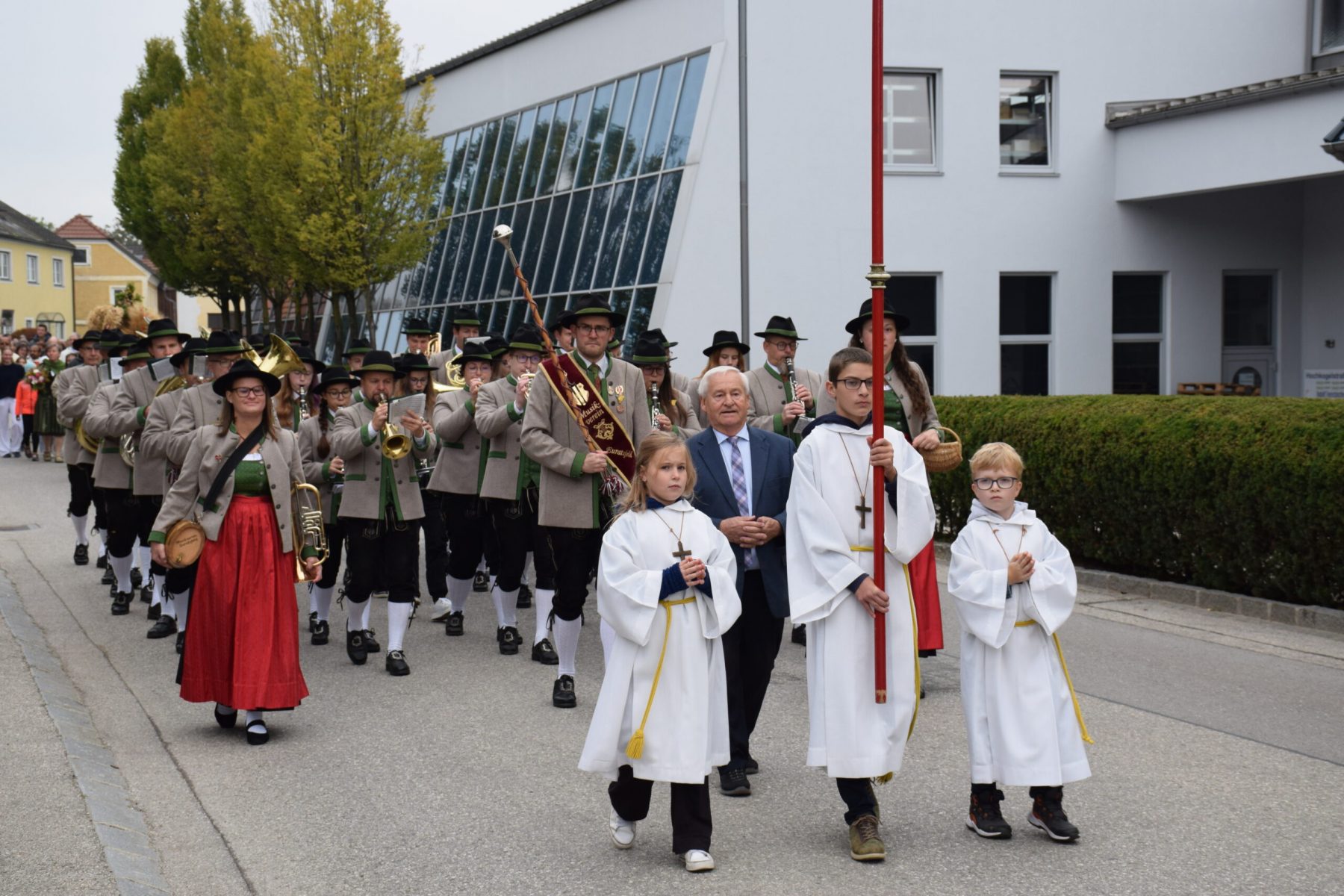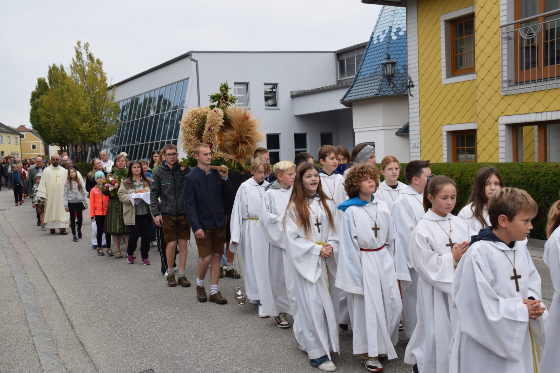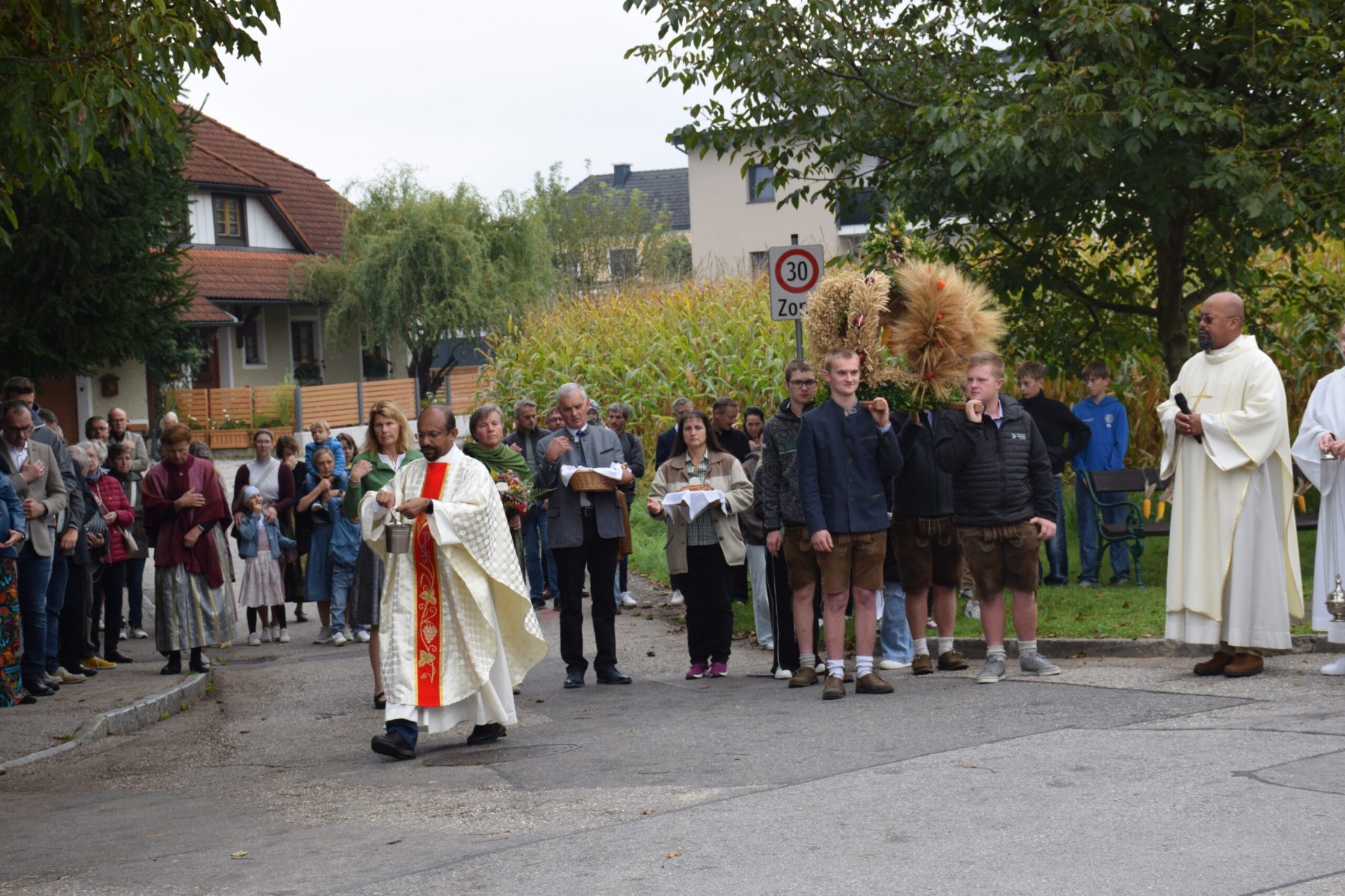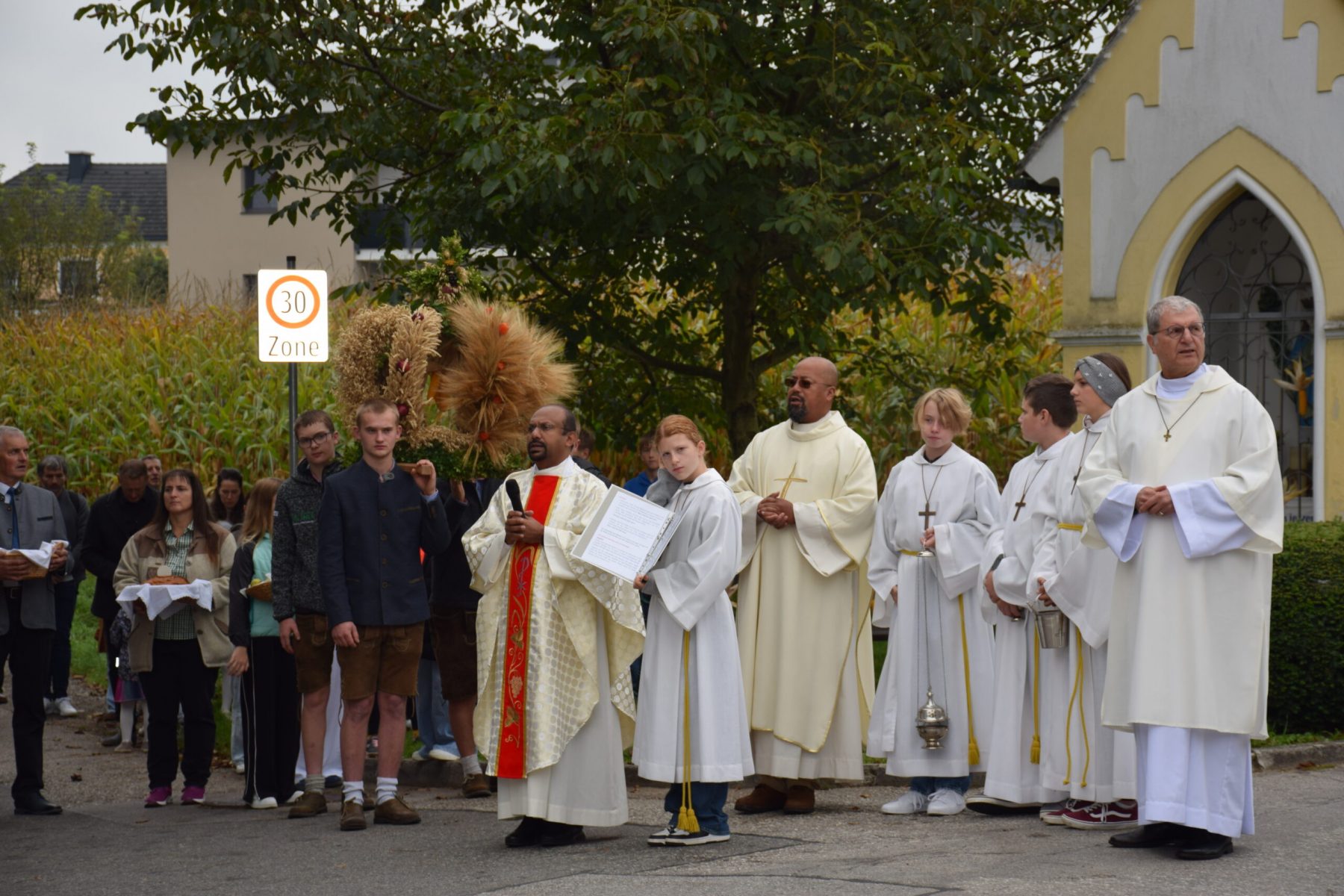 In Begleitung der Blasmusikkapelle führte der Weg traditionell vom Marktplatz zur Gschöpf-Kapelle! Dort wurde die Erntekrone gesegnet. In einer feierlichen Prozession ging es zurück zur Kirche, wo Pfarrer Wilson die Hl. Messe zelebrierte.