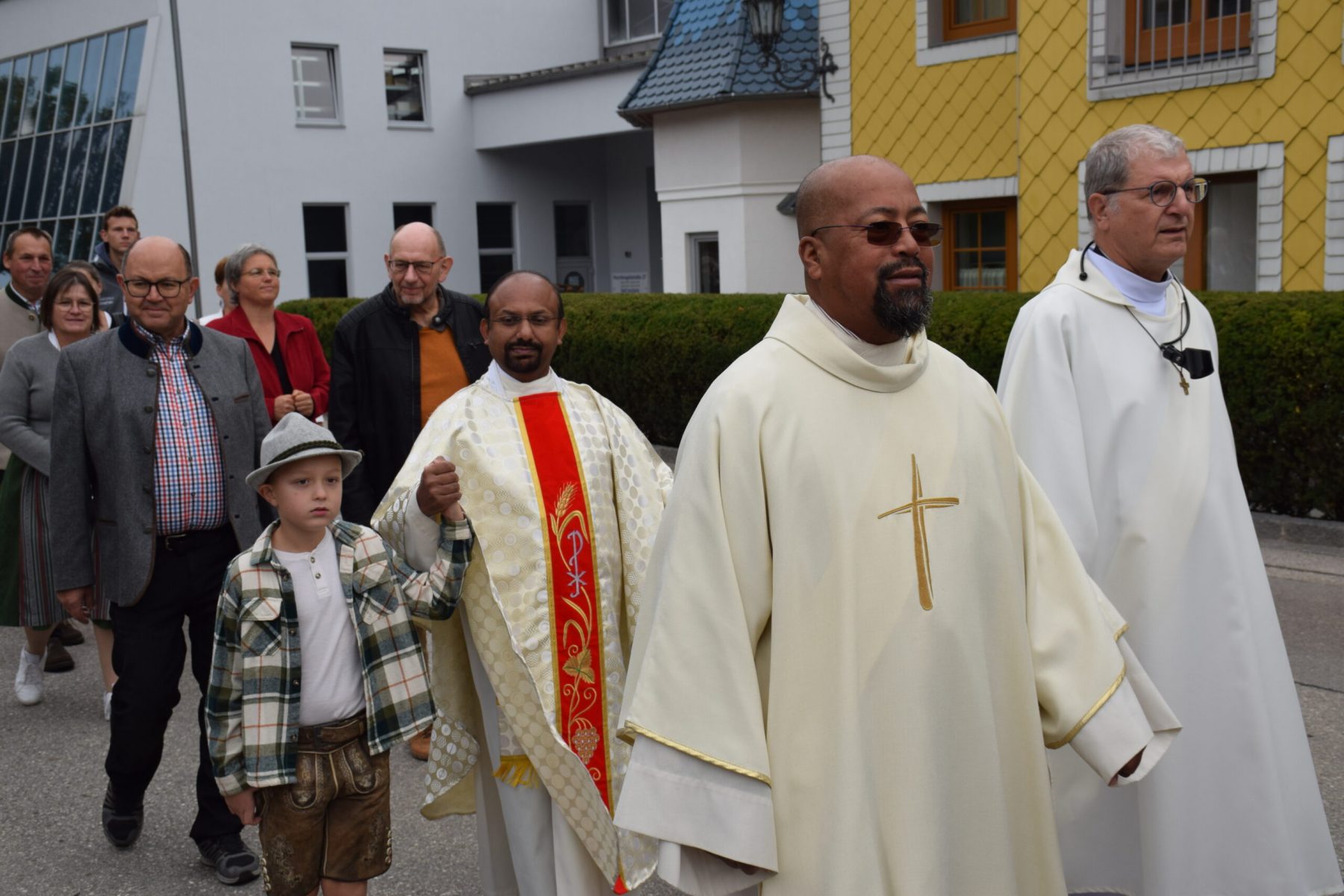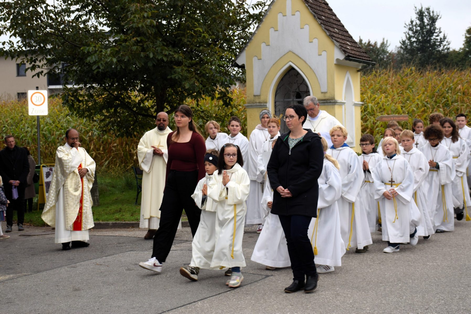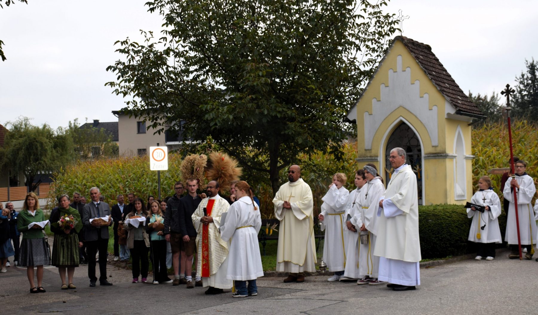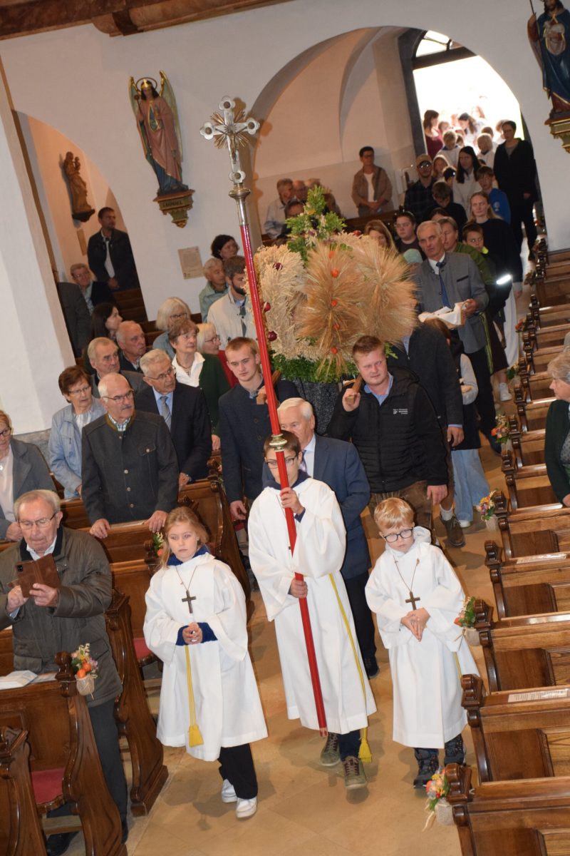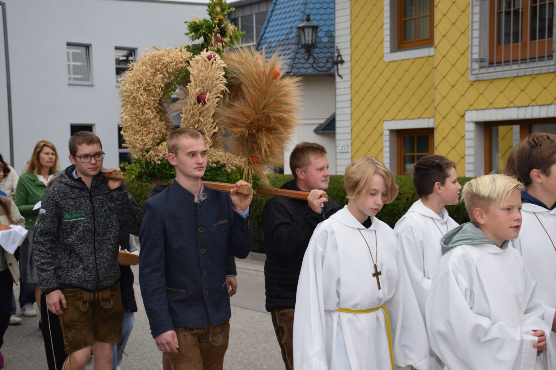 In Begleitung der Blasmusikkapelle führte der Weg traditionell vom Marktplatz zur Gschöpf-Kapelle! Dort wurde die Erntekrone gesegnet. In einer feierlichen Prozession ging es zurück zur Kirche, wo Pfarrer Wilson die Hl. Messe zelebrierte.