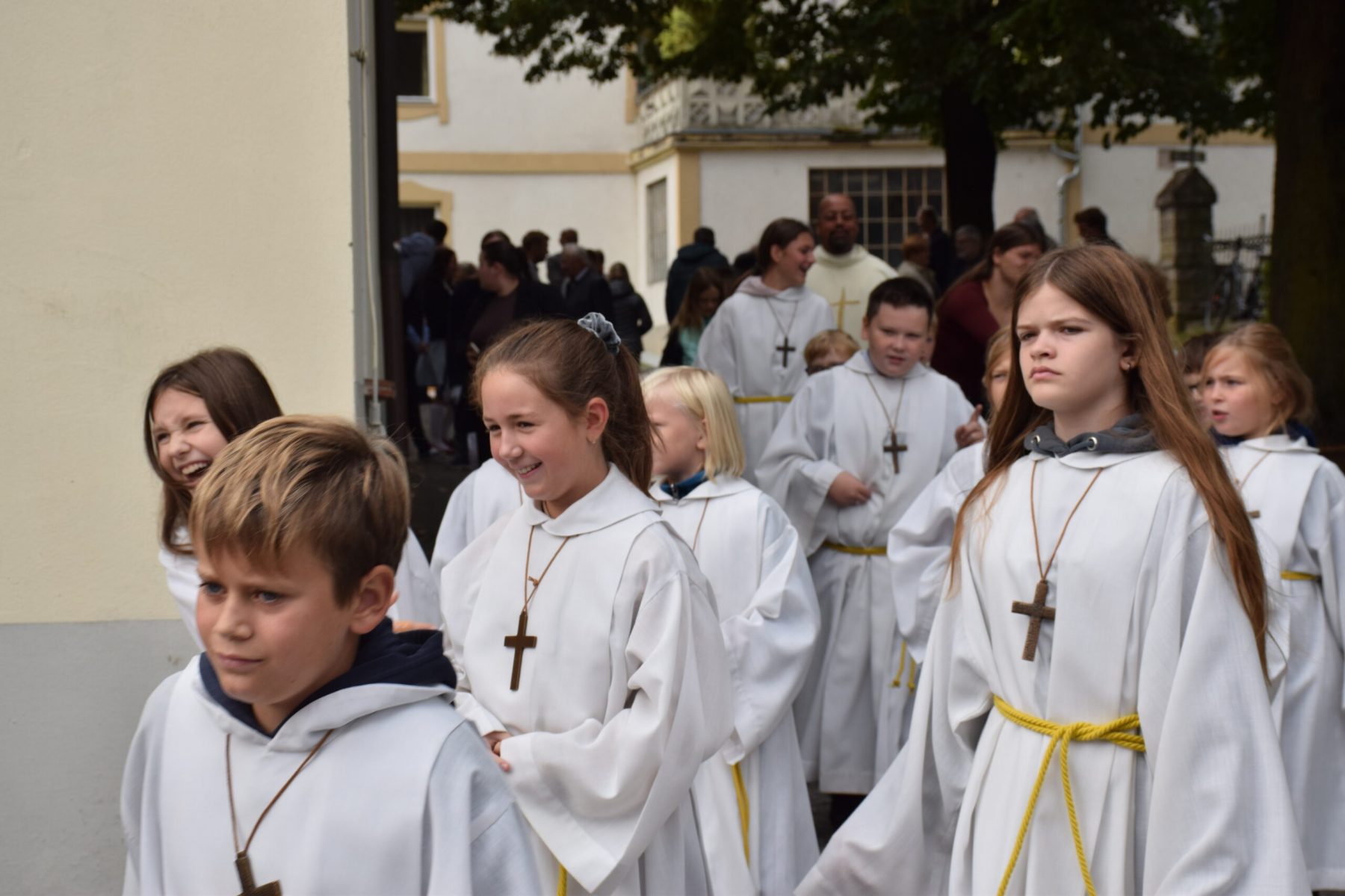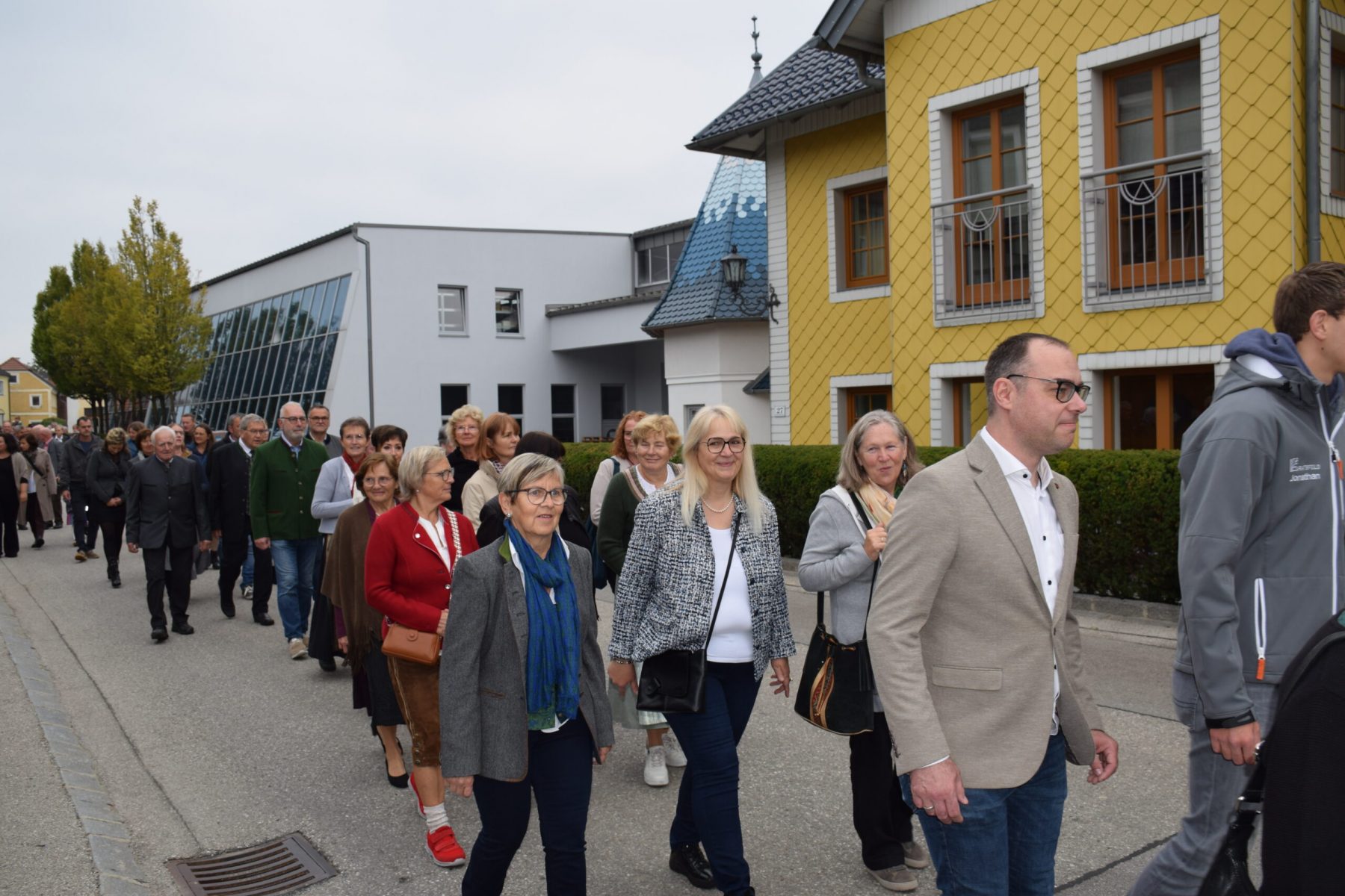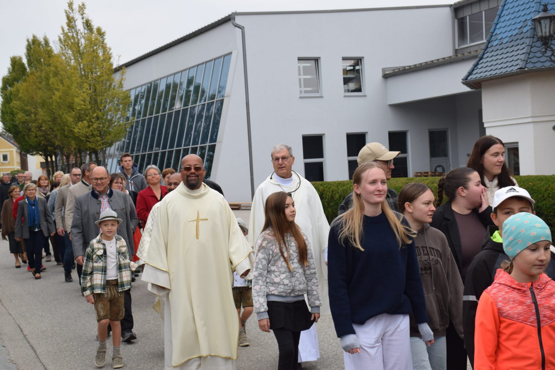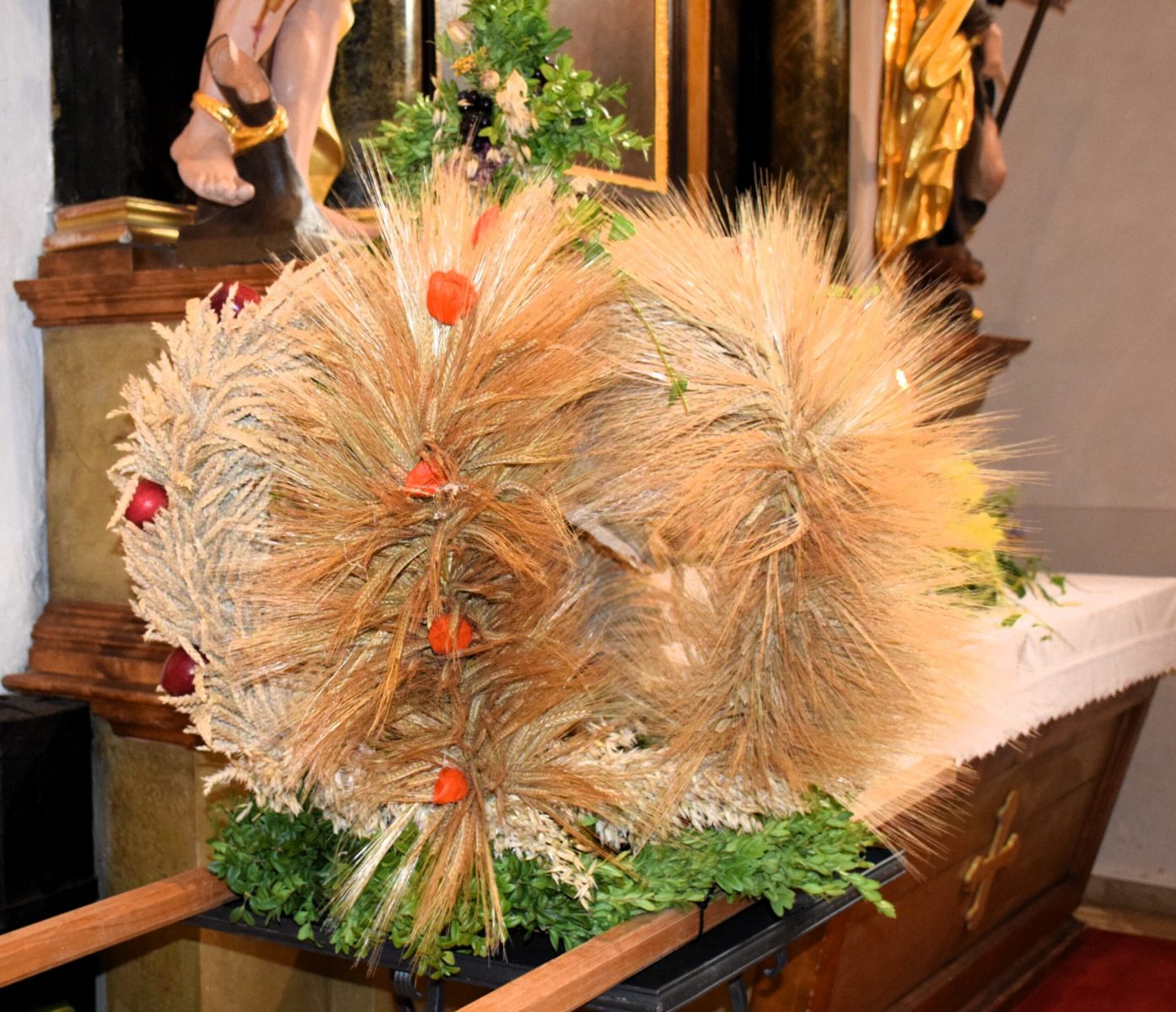 In Begleitung der Blasmusikkapelle führte der Weg traditionell vom Marktplatz zur Gschöpf-Kapelle! Dort wurde die Erntekrone gesegnet. In einer feierlichen Prozession ging es zurück zur Kirche, wo Pfarrer Wilson die Hl. Messe zelebrierte.
