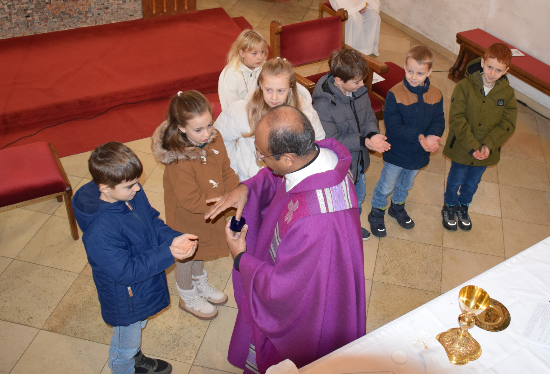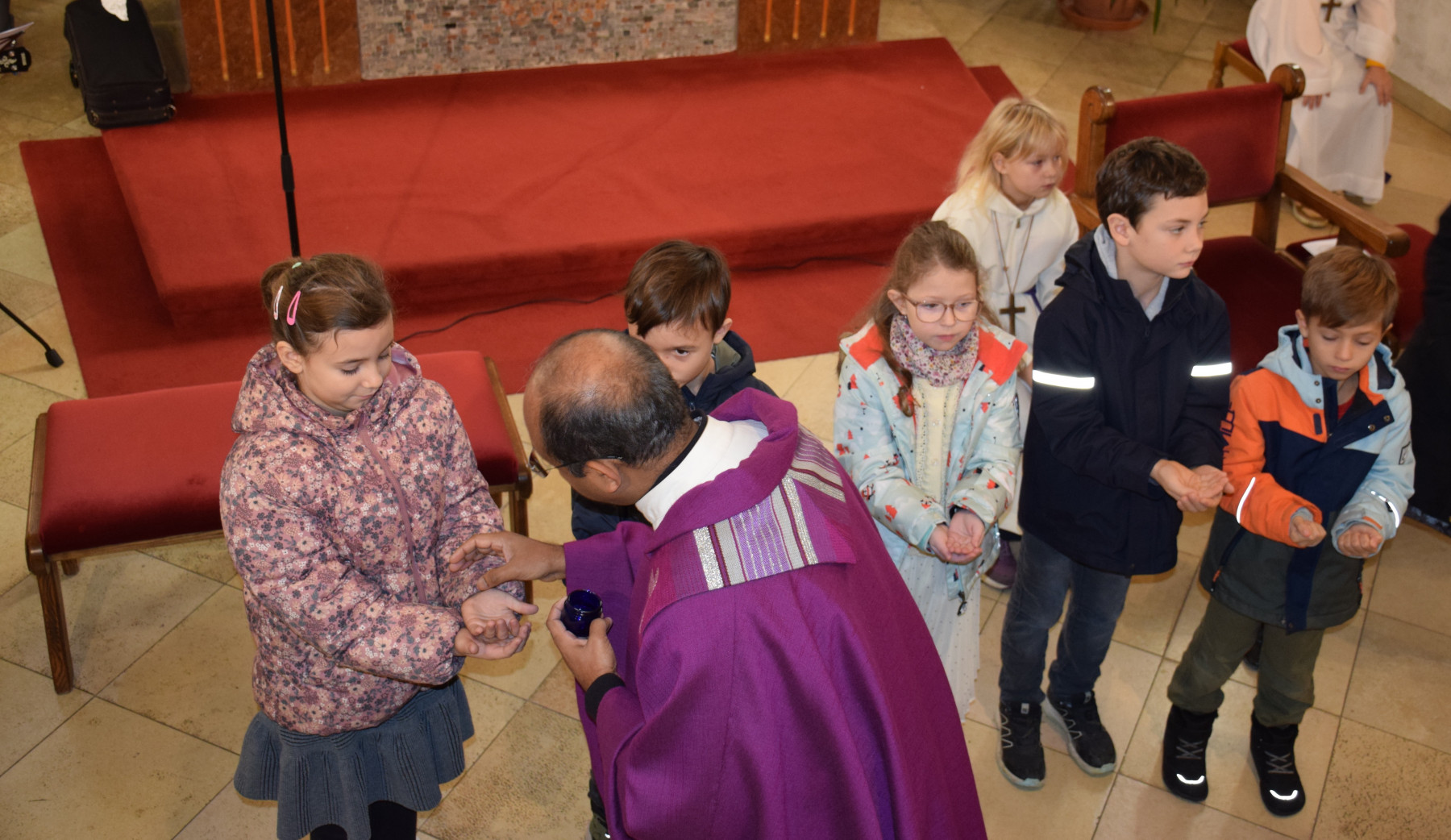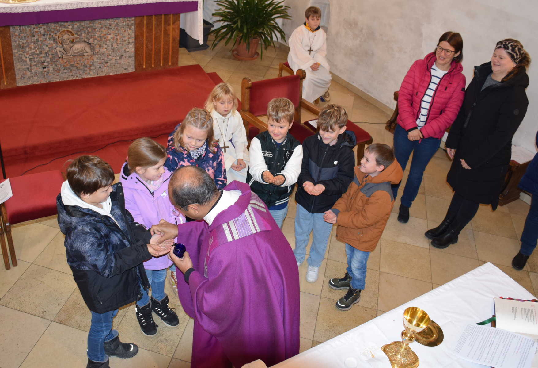 Ein sehr schöner Moment war auch, als Herr Pfarrer den Kindern die Hände salbte und den Platz segnete, wo sie im April die Heilige Kommunion empfangen dürfen.