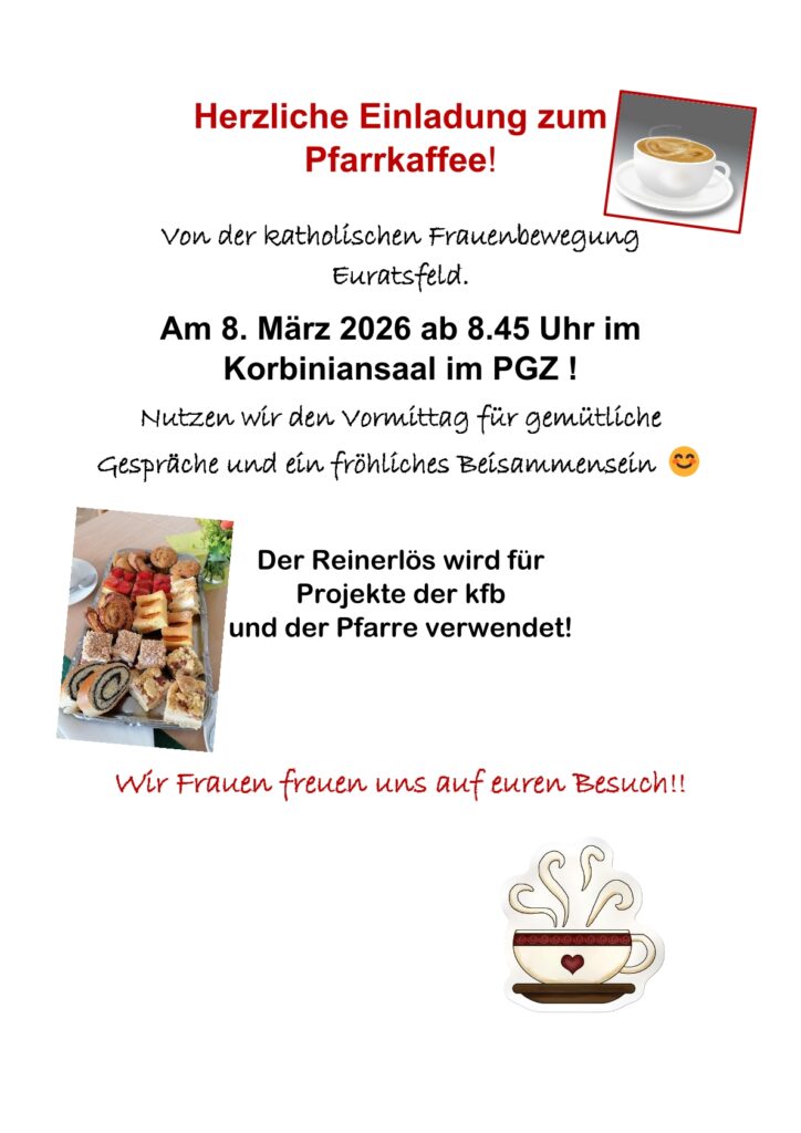 Pfarrkaffe der katholischen Frauenbewegung Beitrags-Autor:Thomas Ehardt Beitrag veröffentlicht:9. Februar 2026 Beitrags-Kategorie:KFB / Pfarrbeitrag Schlagwörter: Pfarrkaffee der KFB Das könnte dir auch gefallen Adventkonzert in der Pfarrkirche Euratsfeld 11. Dezember 2025 Vorstellung der Erstkommunionkinder 2026 11. Dezember 2025 Die Lange Nacht der Kirchen 2023 1. September 2023