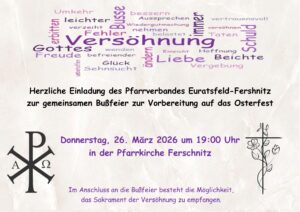 Heute lädt der Pfarrverband Eurastfeld-Ferschnitz um 19:00 Uhr alle sehr herzlich zur gemeinsamen Bußandacht zur Vorbereitung auf Ostern in die Pfarrkirche Ferschnitz ein. Im Anschluss an die Bußandacht ist Beichtgelegenheit.