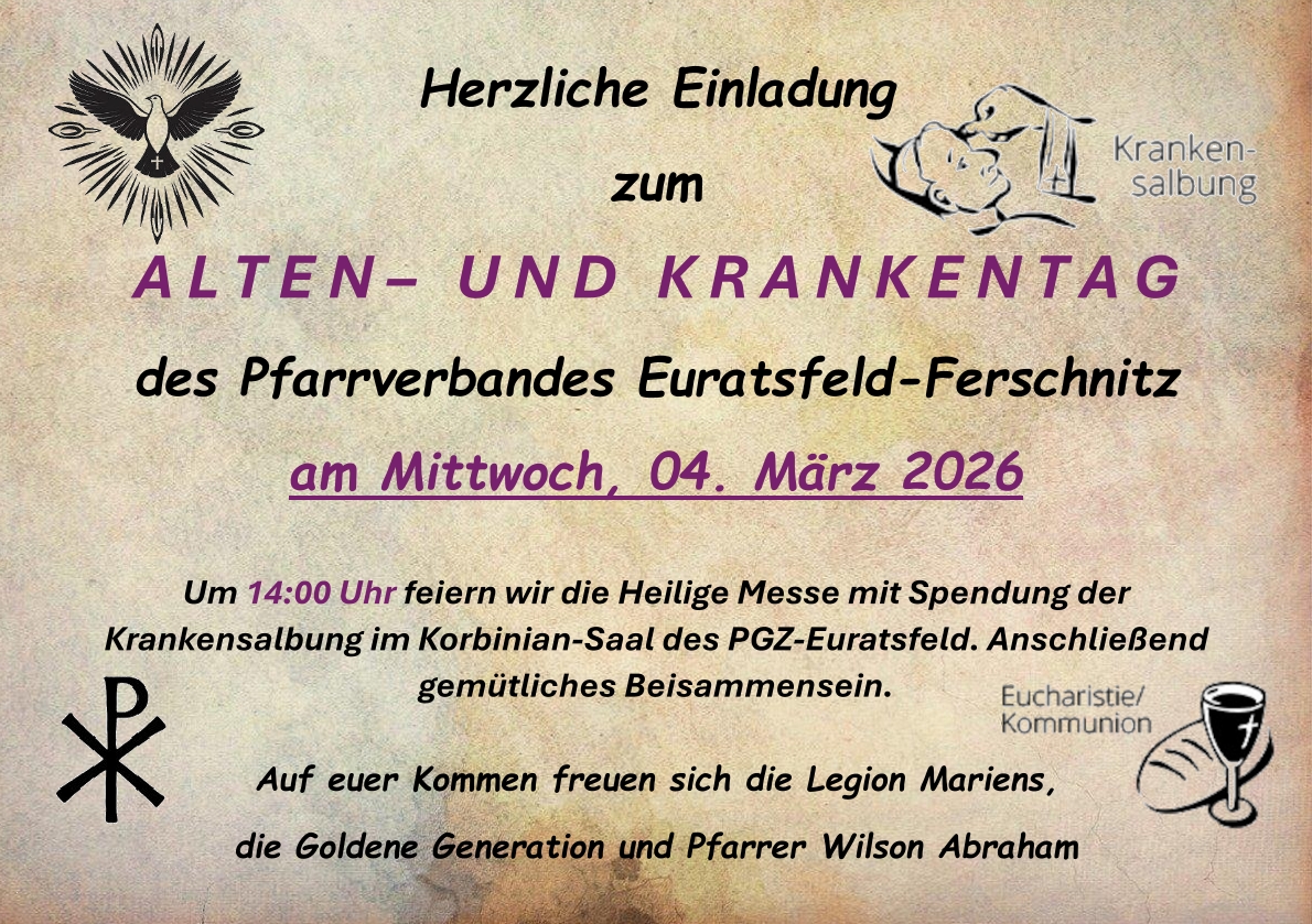 Heute lädt der Pfarrverband Euratsfeld-Ferschnitz alle zum Alten- und Krankentag ins PGZ ein. Um 14 Uhr feiern wir die Heilige Messe mit Spendung der heiligen Krankensalbung. Anschließend gemütliches Beisammensein.