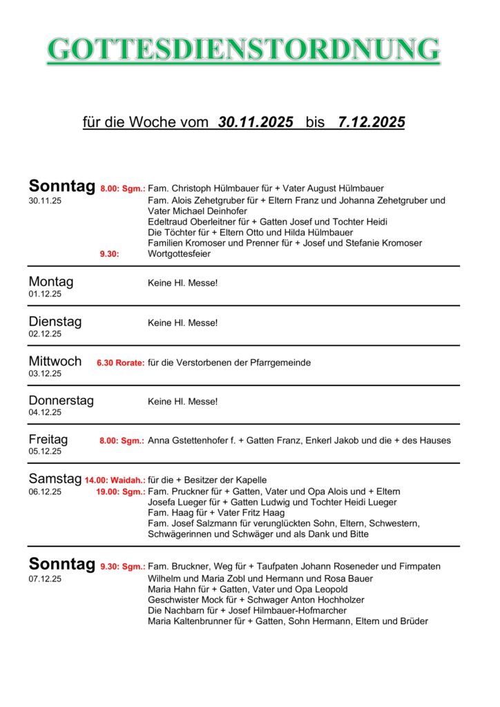 Gottesdienstordnung für die Woche vom 30.11.2025 bis 07.12.2025