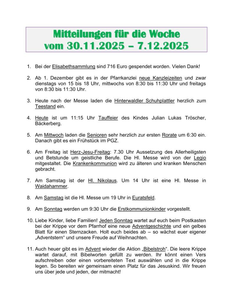 Gottesdienstordnung und Mitteilungen für die Woche vom 30.11.2025 bis 07.12.2025