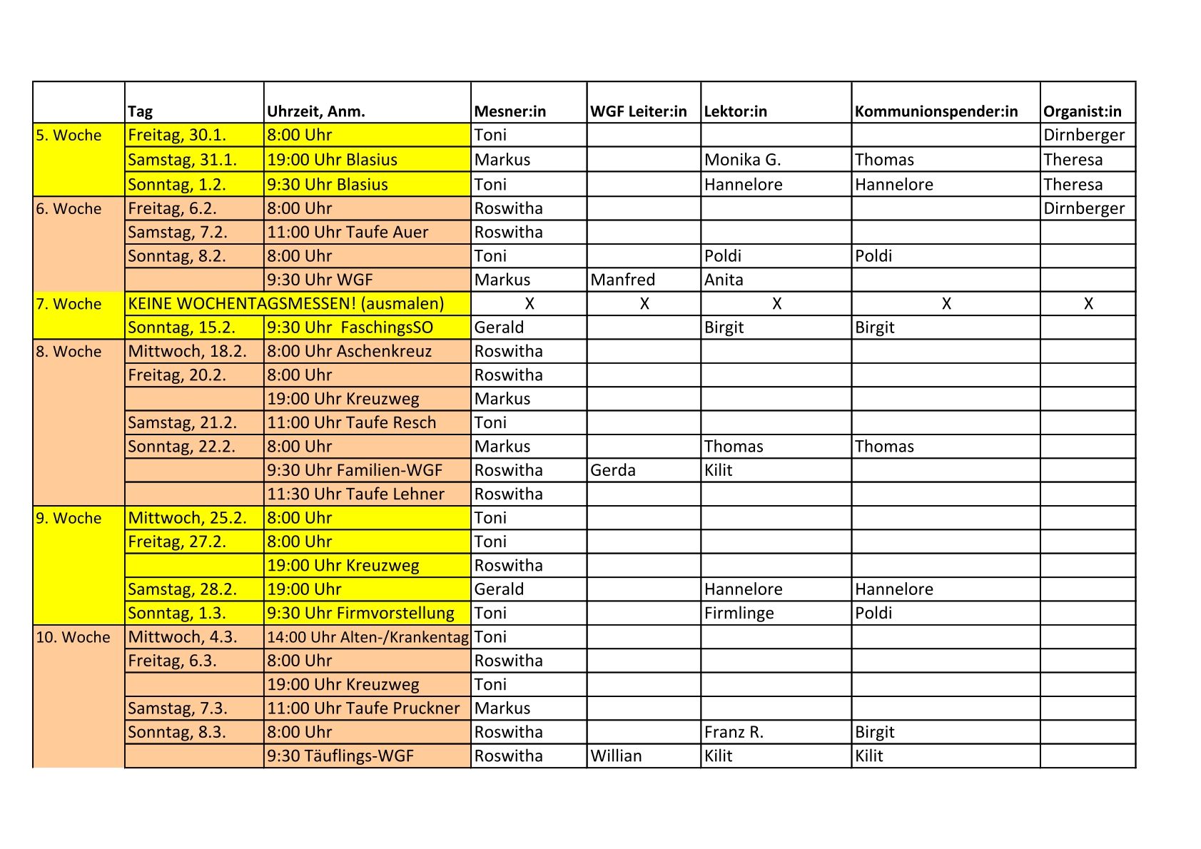 Einteilung der Messner:innen, Lektor:innen, Kommunionhelfer:innen & WGF-Leiter:innen